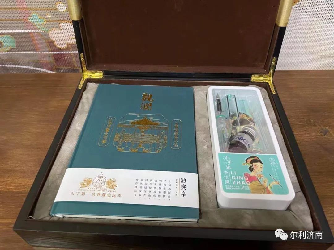 錄制結(jié)束后,主辦方還為王珮瑜特別準(zhǔn)備了一份禮物—天下第一泉文創(chuàng)設(shè)計(jì)的城市伴手禮。這份伴手禮是由一支李清照題材的文創(chuàng)鋼筆、兩本以天下第一泉的“觀瀾”、“源清流潔”御題石碑為題材的筆記本組成。禮盒使用了高端畫絹手繪趵突泉的腰封,內(nèi)襯也采用了濟(jì)南傳統(tǒng)技藝制作的泉水扎染。這份禮物體現(xiàn)了濟(jì)南的歷史傳承、泉水文化和“二安文化”。